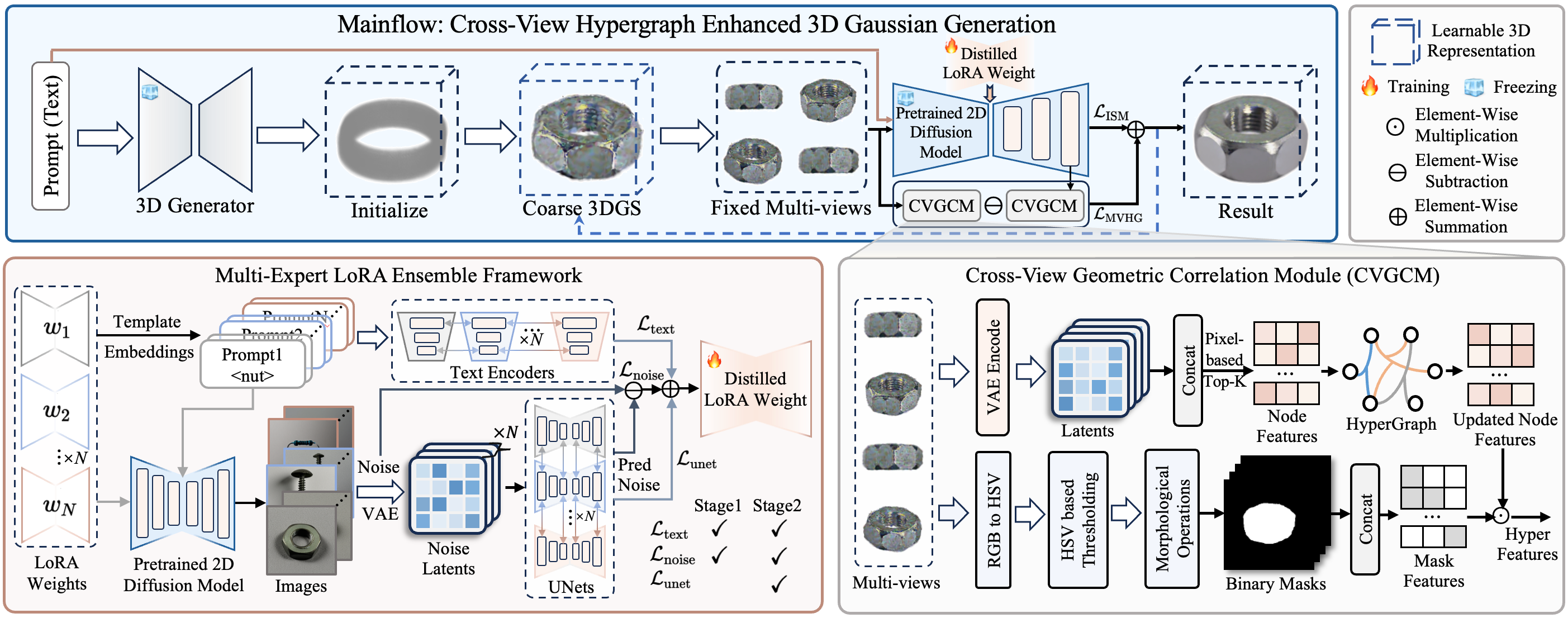 Industrial text-to-3D generation is challenging due to strict geometric constraints, fine-grained topology requirements, and strong demands on structural consistency. We present ForgeDreamer, a framework tailored for high-fidelity industrial asset generation that combines Multi-Expert LoRA distillation with Cross-View Hypergraph enhancement. Multi-Expert LoRA improves domain-specific feature adaptation across diverse part categories, while the Cross-View Hypergraph explicitly models inter-view dependencies to preserve global coherence and local detail simultaneously. Extensive experiments on representative industrial components demonstrate that ForgeDreamer consistently improves geometry quality, topology faithfulness, and visual realism over strong baselines, providing a practical solution for industrial design prototyping and digital-twin content creation.